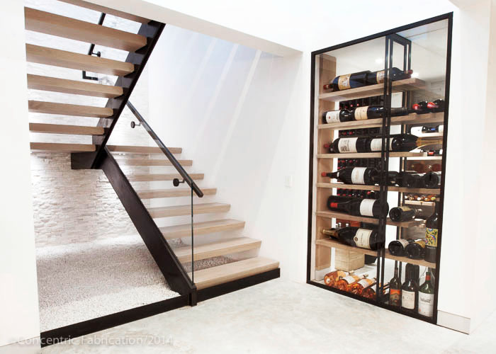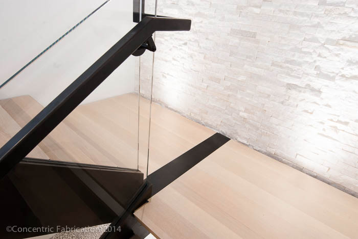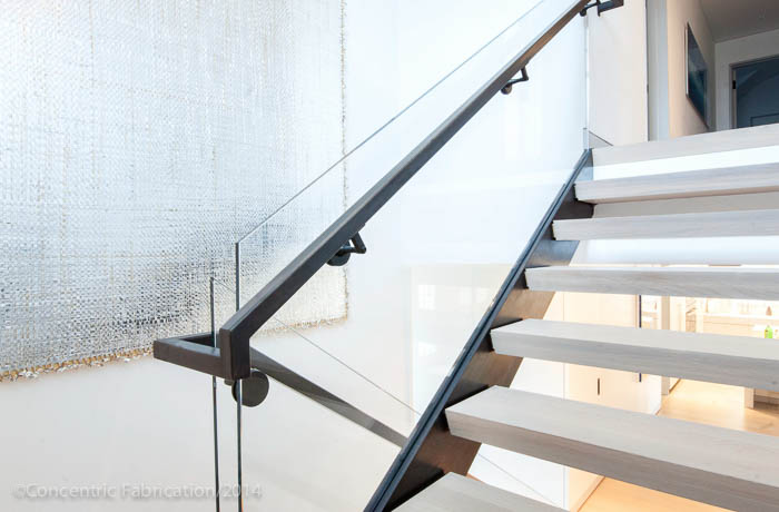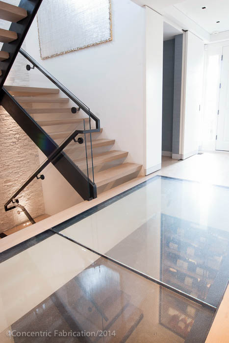 This Workshop APD home offered a number of opportunities for Concentric to apply its craft. The main element of our efforts is the two story main stair supported by 2" steel stringers that carry a glass guardrail. This assembly meets a glass floor on the main level that is supported by a matching blackened metal frame. The glass floor looks down on a wine cellar and tasting room with elements built by Concentric. The living room features a grand fireplace that has a blackened metal insert and brushed stainless steel hearthplate. The guest house had a custom handrail fabricated between floors. A cable rail was also installed on the main house exterior stair.
